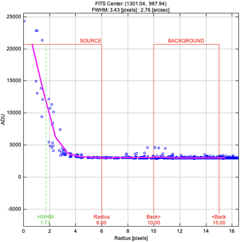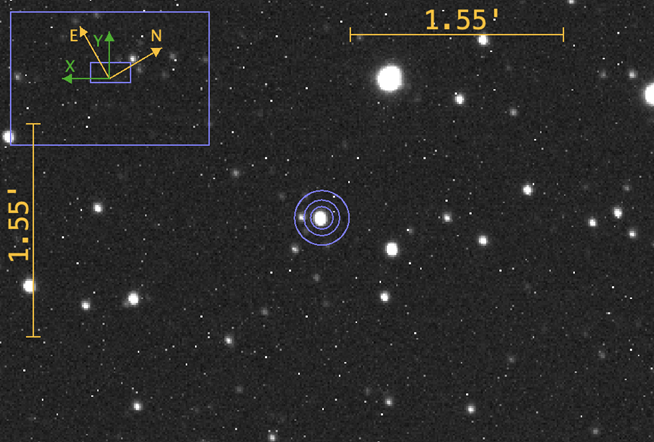 The blue concentric circles represent the photometric aperture (the inner circle) and the background annulus (between the middle and the outer circle) where the horizon/vertical scale shows 1.55 arcminutes.