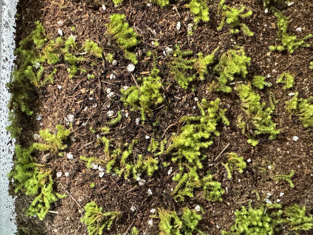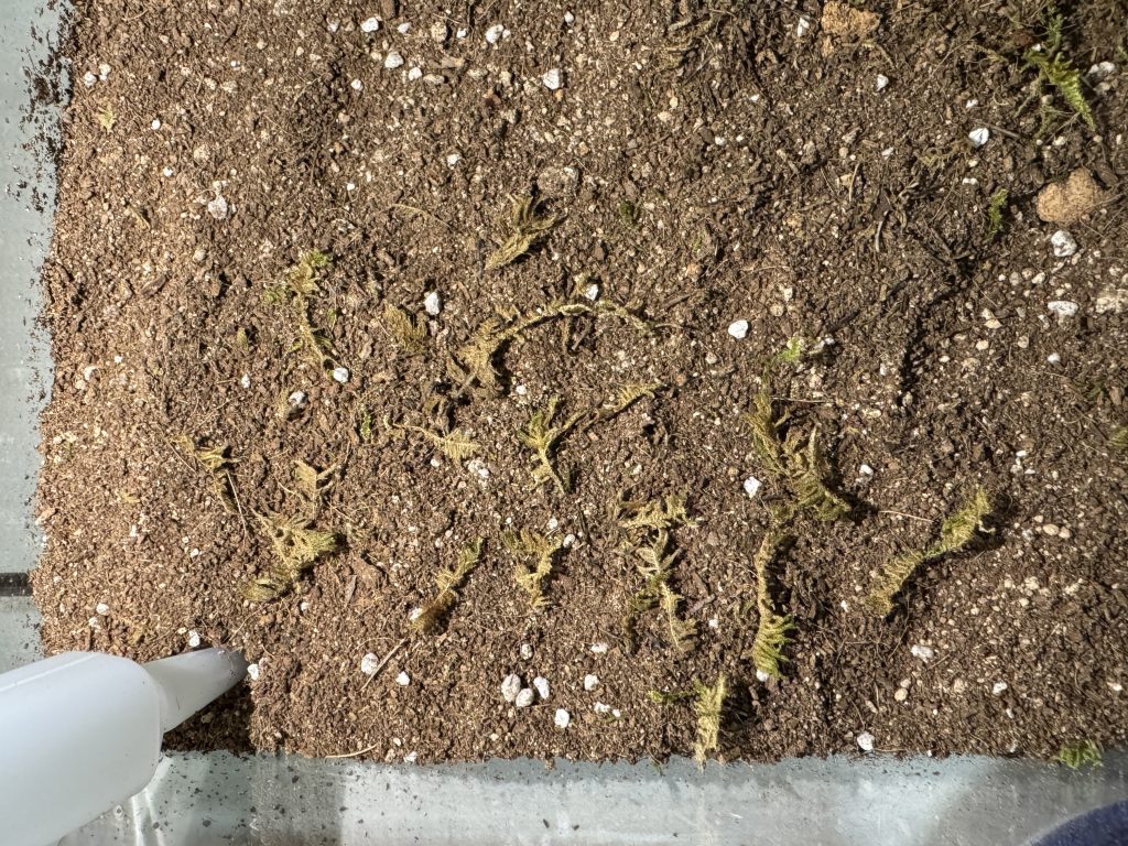 In this experiment, designed to simulate post-wildfire conditions, the surface of the cultivation soil was covered with ash instead of leaving it bare. Moss and seed balls were then placed on top to examine whether they could sur vive under such conditions. The size of the seed balls was the same as in the previous experiments (1.5 – 2 cm in diameter), and the moss fragments were 0.5 – 1 cm in length.