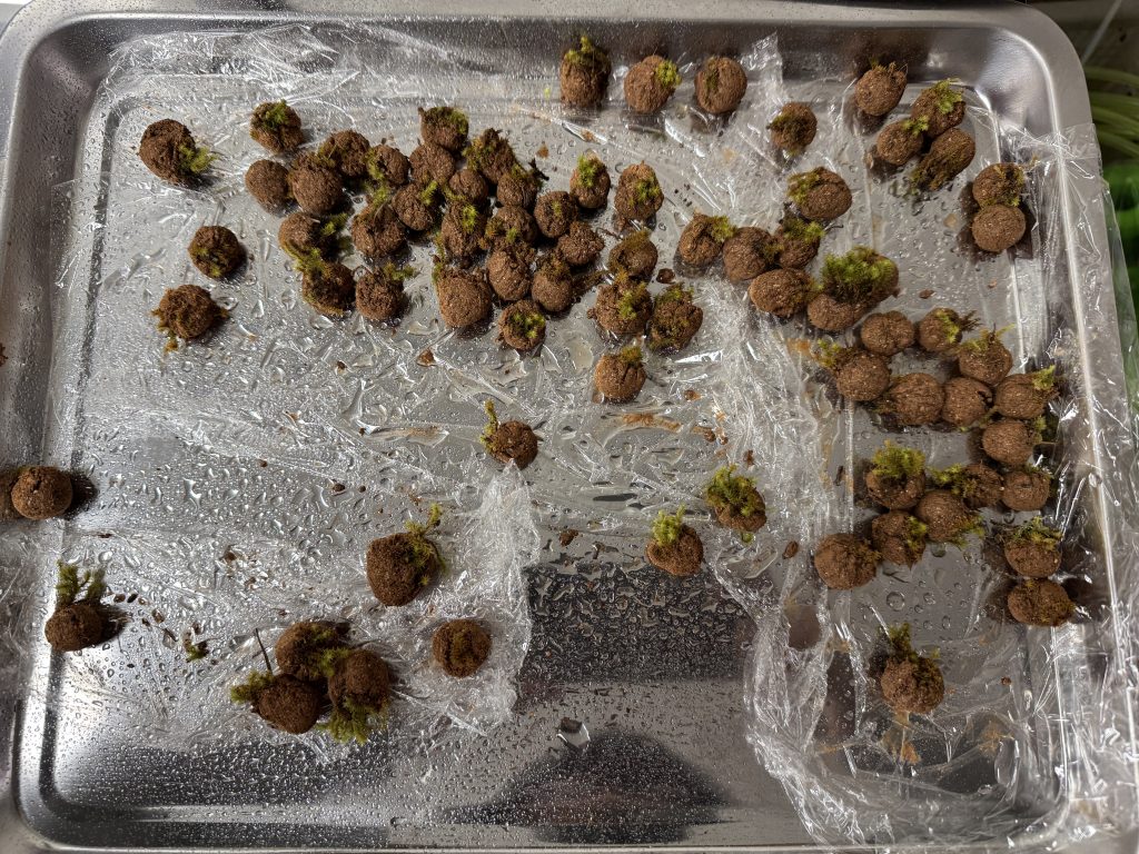 In the first seed ball production experiment, 11 seed balls containing Hypnum plumaeforme were produced. Only 1 survived (9.1%), while the remaining 10 died after drying. In the comparative experiment, 14 fragments of Hypnum plumaeforme were tested and none survived (0%). In contrast, 14 fragments of Racomitrium canescens were tested and 12 survived (85.7%) after three weeks, confirming that it is a highly viable species for seed ball application.
