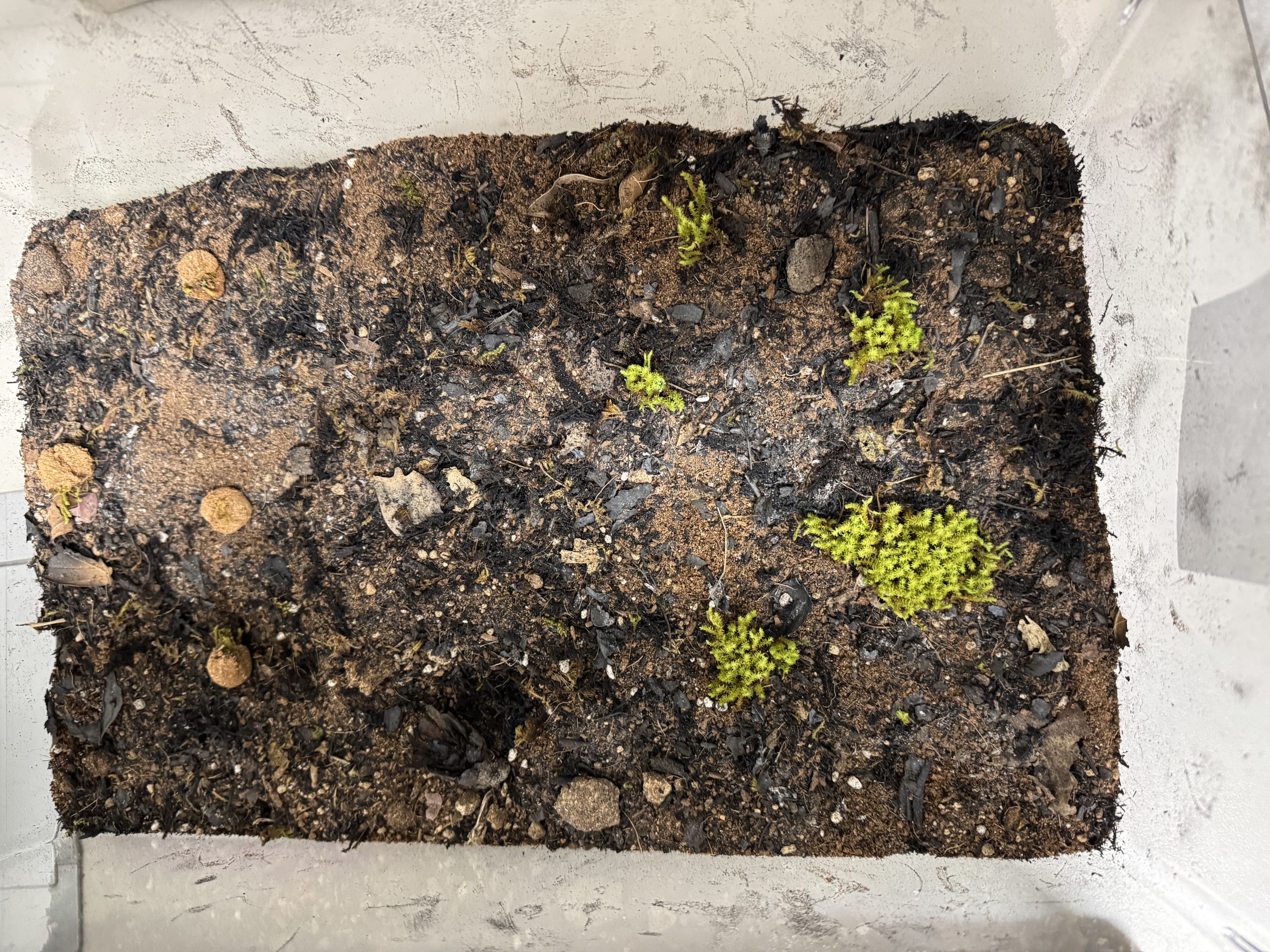 In this experiment, designed to simulate post-wildfire conditions, the surface of the cultivation soil was covered with ash instead of leaving it bare. Moss and seed balls were then placed on top to examine whether they could sur vive under such conditions. The size of the seed balls was the same as in the previous experiments (1.5 – 2 cm in diameter), and the moss fragments were 0.5 – 1 cm in length.