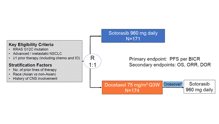 Figure 1 presents the CodeBreak 200 study in lung cancer. This study compared OS between the new treatment of Sotorasib and the standard-of-care treatment of Docetaxel. Treatment crossover was allowed in this clinical trial and refers to patients who were originally assigned to the docetaxel group (orange box) but were later permitted to switch to the sotorasib group (blue box). This is shown by the blue arrow labeled “Crossover” connecting the two treatment arms. These patients began with standard chemotherapy but were later given access to the investigational drug, often after they failed the chemotherapy with disease progression1.