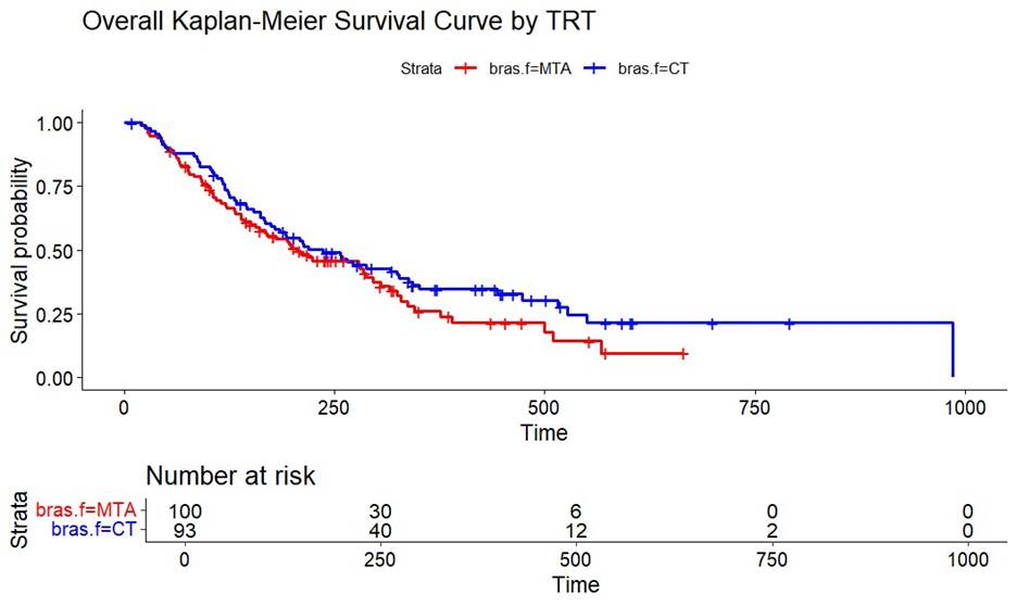 To assess the impact of crossover on both arms, OS of the SHIVA01 study was analyzed in R package “trtswitch” by the conventional 2-stage method15. The dataset has 100 patients on the MTA arm and 93 patients on the CT arm. Table 1 shows the basic statistics from the dataset used in this analysis using R version 4.5.1.