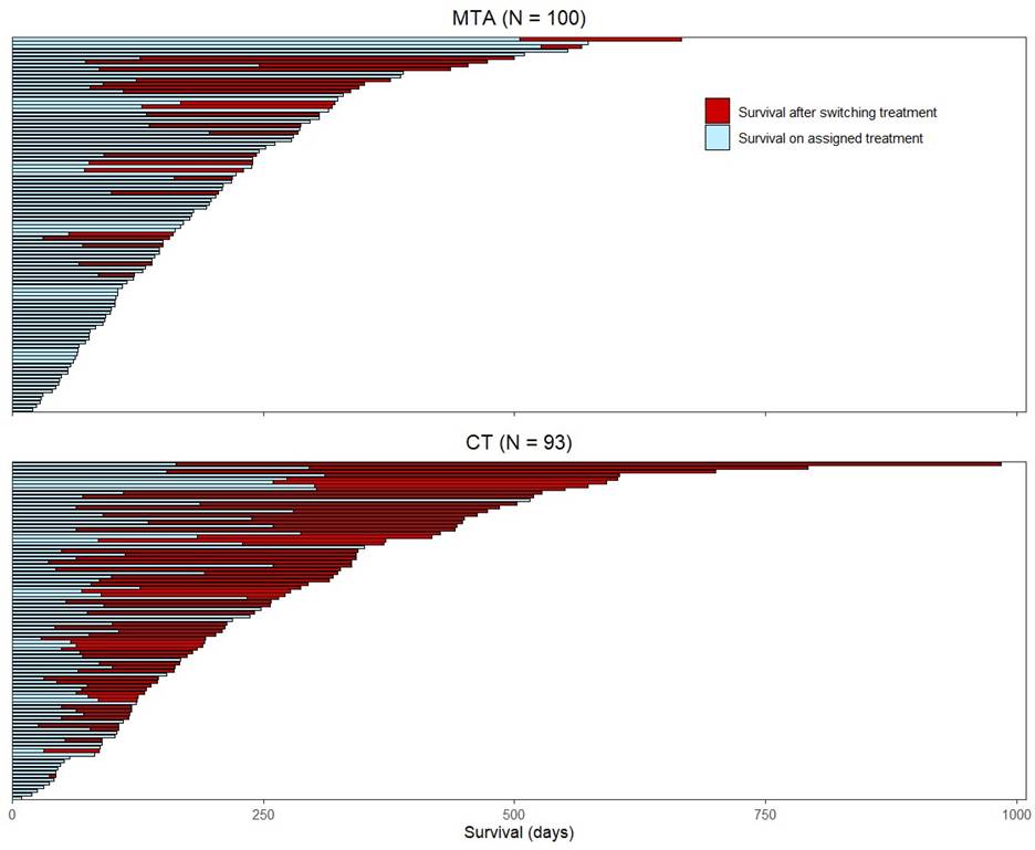 molecular pathway altered (i.e., the hormone receptors pathway, the PI3K/ AKT/mTOR pathway, and the RAF/MEK pathway). In Figure 2, the swimmer plot provides further details on the time of crossover for all patients. Each line represents the survival time for a patient and the red part represents the survival contribution post-crossover. Crossover rate accounted for 55% of the OS time for the CT arm and 22% for the MTA arm, thus indicating the CT arm might have benefited more from the crossover compared to the MTA arm. Figure 3 shows the OS Kaplan-Meier (KM) curve based on the original data. It appears that CT had better treatment effect compared to MTA based on analysis without crossover adjustment.
