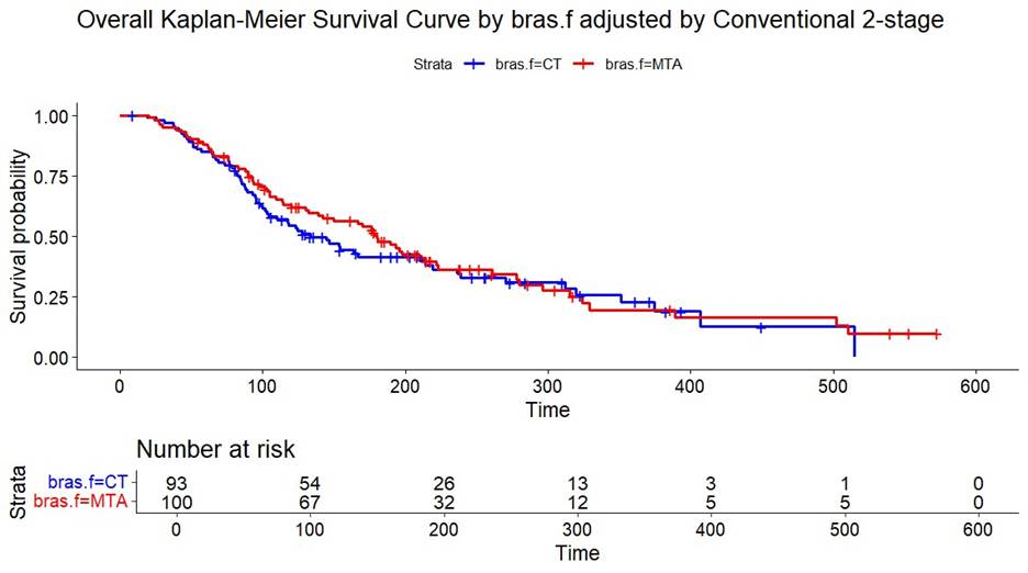 The acceleration factors of 3.12 and 2.67 for the CT arm and the MTA arm, respectively, were obtained. Figure 4 shows the KM curves after adjustment. In Stage 2, based on the counterfactual data, the proportional hazards model with adjustment of the five baseline variables generated HR (95% CI) of MTA versus CT of 0.86 (0.61, 1.22). These baseline variables were selected because of their potential prognostic effect on OS16. It appears that MTA had some trending treatment effect compared to CT after adjusting for crossover.