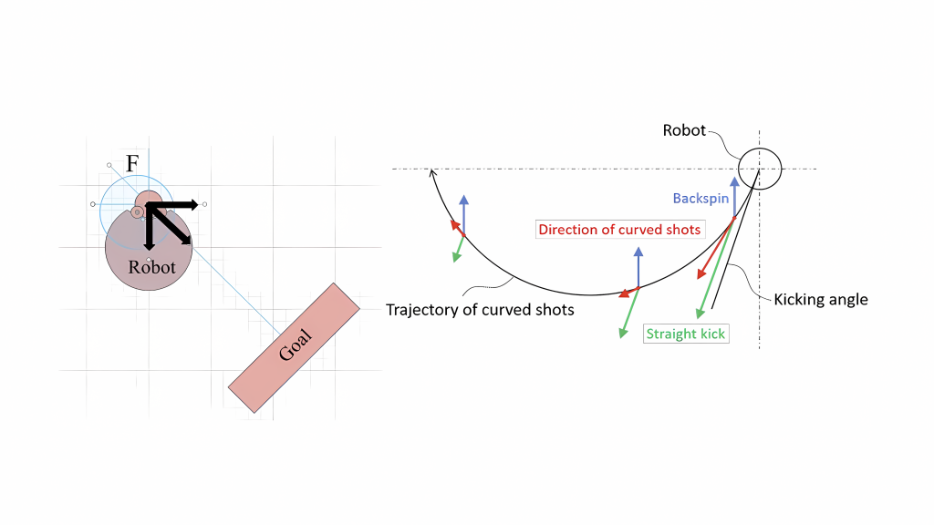 In Fig. 1.b, the overview of force interactions acting on the ball is illustrated. Based on the diagram adapted from previous studies (right), vector decomposition is crucial for understanding the curved motion of the ball. To induce such motion, a dribbling system and a solenoid device were implemented. The ball control strategy employed in this study differs from those in earlier research, primarily due to the relatively small size of the field. Instead of replicating the curved shot trajectories emphasized in previous work, this study focuses on effectively transferring the ball’s spin-induced inertia to enable it to move directly toward the goal, even when the robot is positioned far from it.