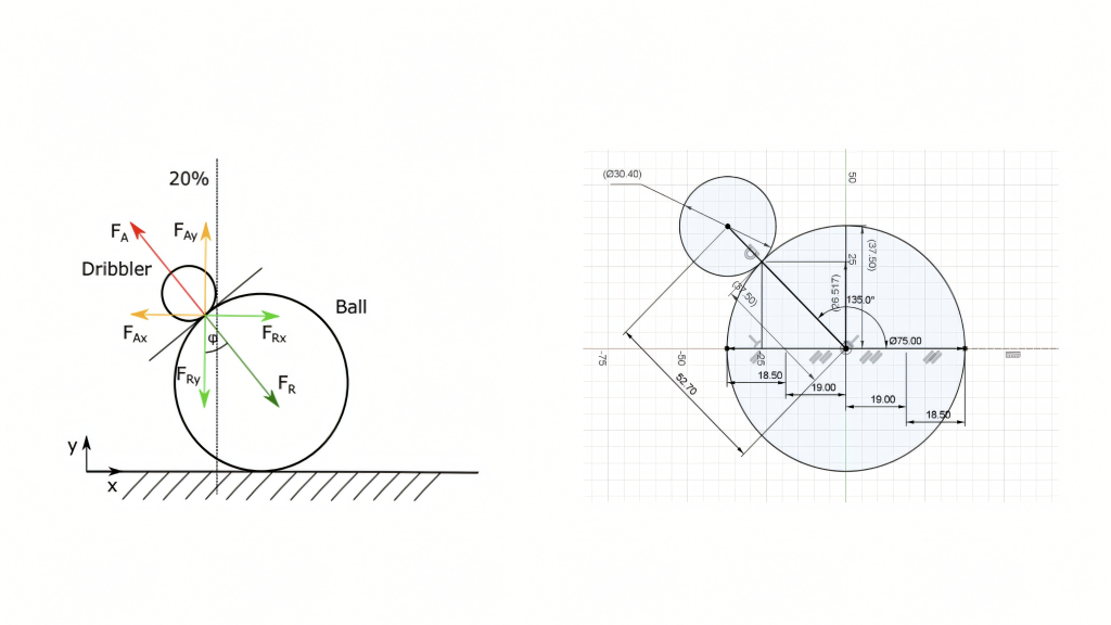 The interaction between the dribbler system and the ball follows Newton’s third law. The forces exerted by the robot and the ball form an action-reaction pair Fig 1.a (left). This dynamic relationship determines how long the robot can maintain the ball possession while the continual impact from the ball and other robots. To enable omnidirectional movement while spinning the ball, the force applied to the ball must overcome the frictional resistance from the field surface Fig 1.a (right). An RPM of 2352(no load) was experimentally determined to maintain ball control to overcome the friction from the field.