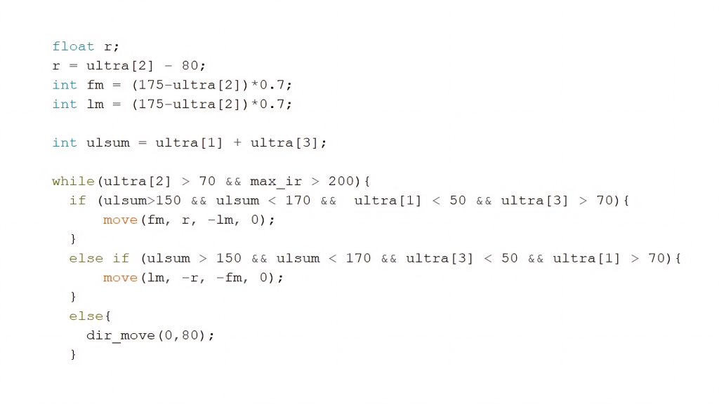 , were defined to serve as part of the ultrasonic sensor-based feedback control system for forward motion. These are designed to reduce the robot’s speed near the goal area, thereby increasing positional precision when delivering the ball into the goal. Fig 4.b presents the C-language implementation of the ultrasonic sensor feedback control system.