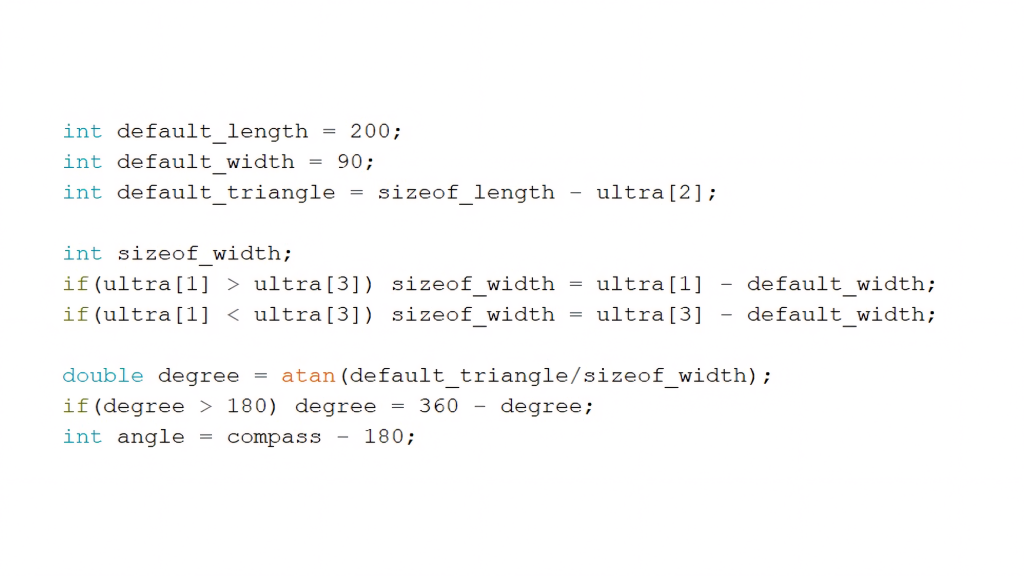 The code in Fig 4.c utilizes three ultrasonic sensors to calculate the angle between the robot’s heading direction and the center of the goal. Assuming a fixed field size, the distances from the robot to the side walls were measured using two side-facing ultrasonic sensors. Additionally, the distance to the rear wall was obtained using Ultrasonic Sensor 2.