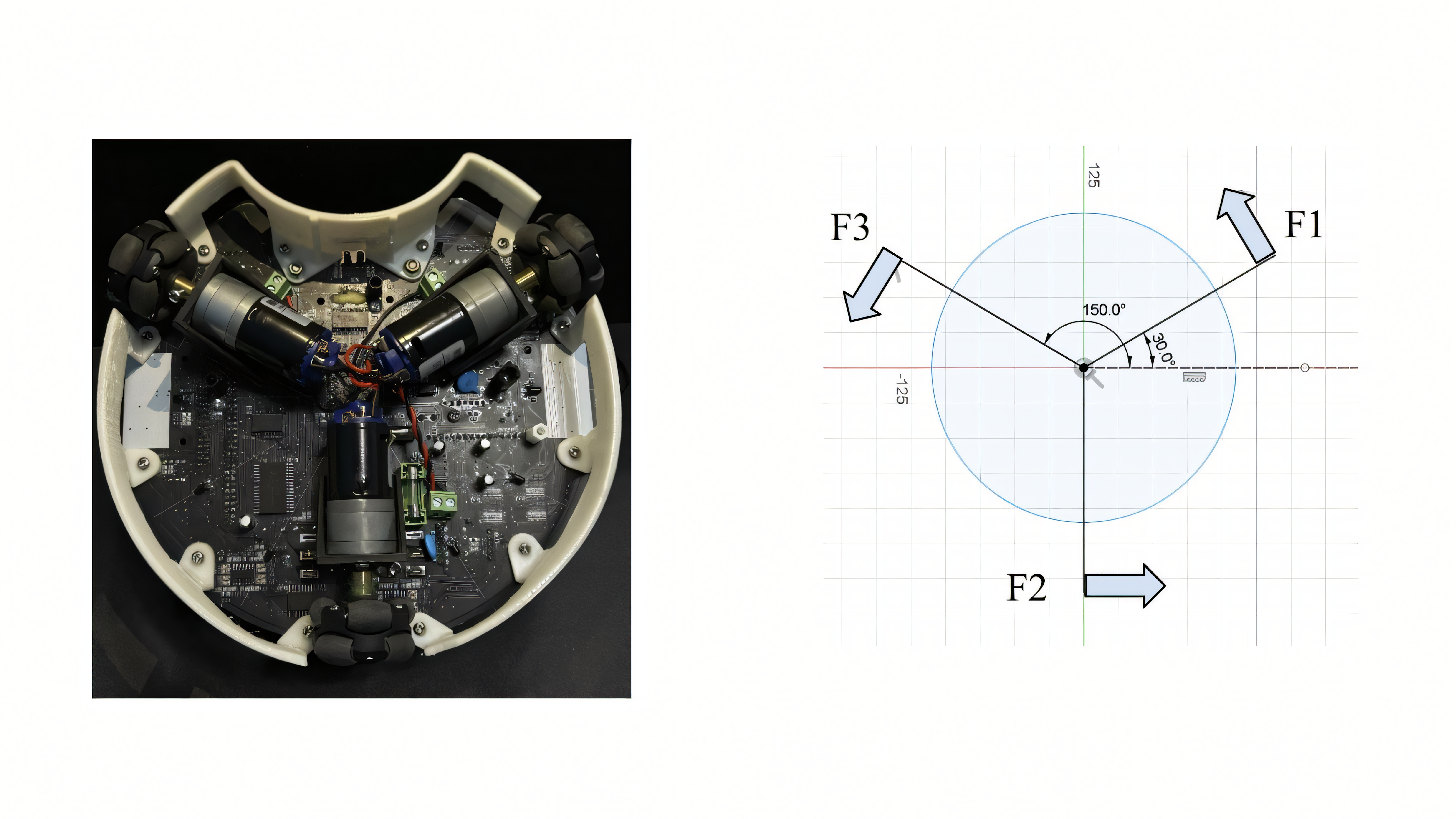 , are derived from the vector sum of the individual motor forces. A compass sensor is employed to stabilize the heading angle of the robot, allowing for accurate linear movement. The wheel orientation angles are defined as