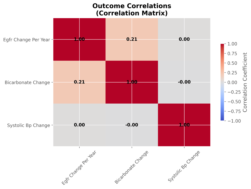 This simulation successfully addressed all stated objectives. It generated a synthetic patient cohort based on a comprehensive meta-analysis, simulated the effects of sodium bicarbonate therapy on eGFR and other outcomes, and assessed confounding and heterogeneity within this simulated environment. Furthermore, it performed sensitivity analyses to evaluate robustness and validated the model’s fidelity against published data. The findings provide a robust set of hypotheses regarding the consistent renal protective effect of bicarbonate and its mixed impact on other outcomes, which can guide future empirical research.