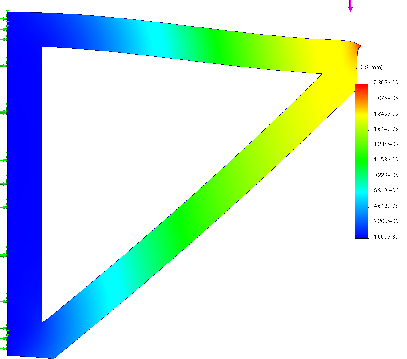 This appendix presents a benchmark of the solver applied to a three-bar right triangle truss. The nodes are located at (0,0), (0,2), and (2,2). Nodes 0 and 1 are fixed, while a vertical load of