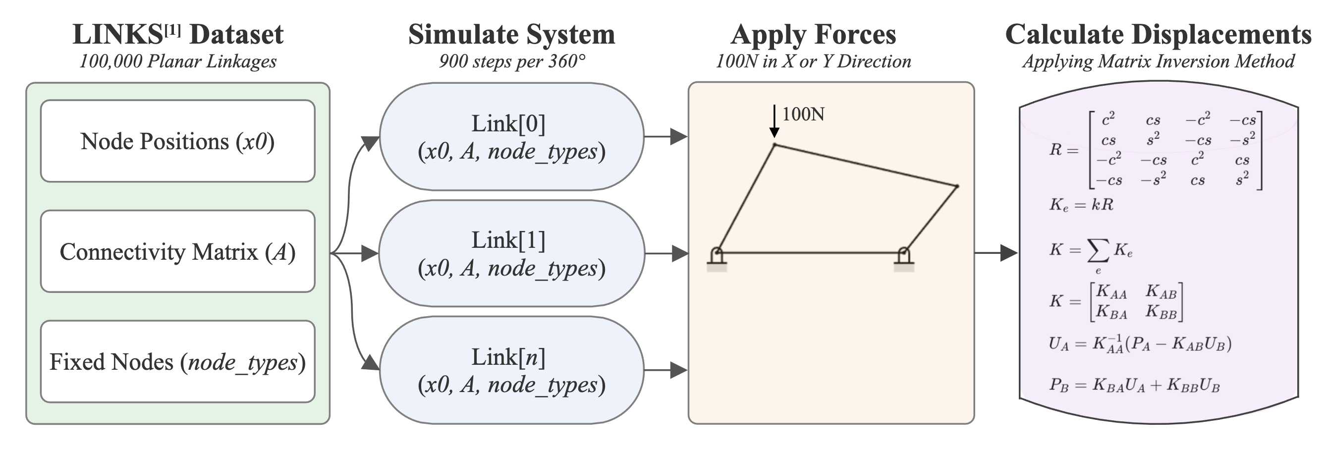 The comprehensive nature of the dataset, containing information on node position, connectivity, force application, and resulting displacements, enables an in-depth analysis of linkage behavior. This rich dataset forms a basis for further research into linkage optimization that can enable superior linkage designs in many applications within robotics and mechanical engineering.