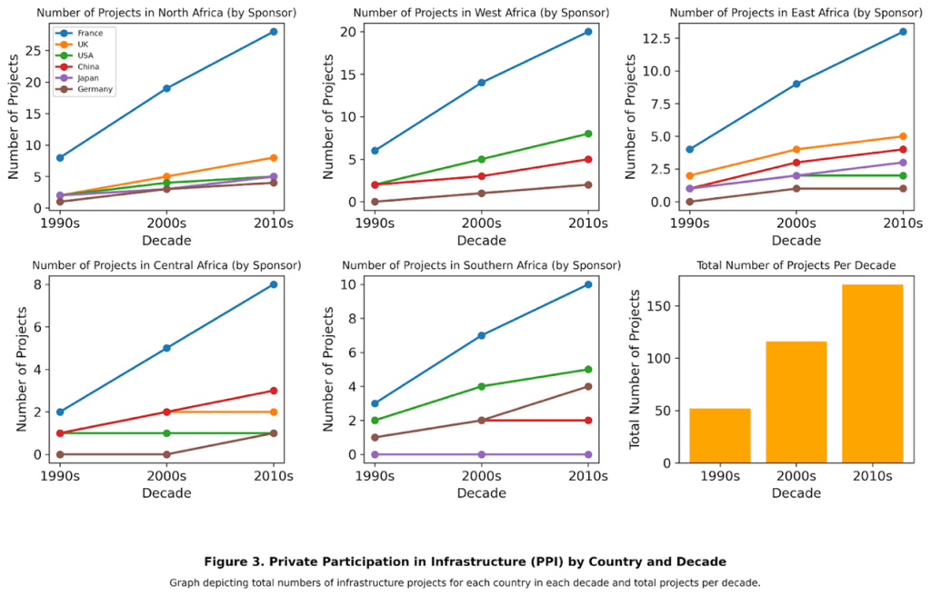 For private participation in infrastructure (PPI), data came from the World Bank’s Private Participation dataset14. After setting the modules to Africa in the eighties, 1990s, and 2000s, I manually sorted the sponsors of projects by which country they are associated with. Once I did so, aggregate scores for how many times each country’s companies were represented in each decade were compiled.