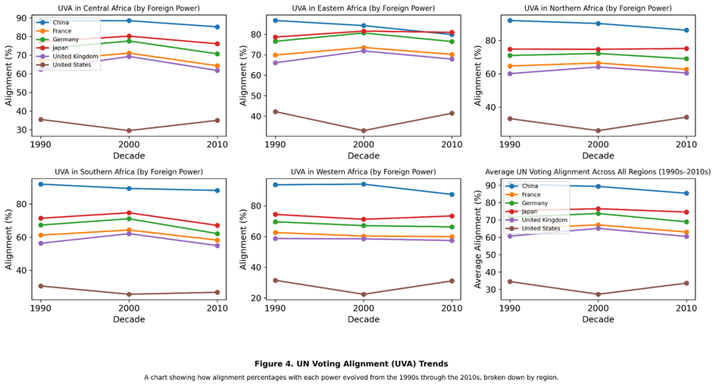 Recalling our overarching question, which foreign power, specifically China or the U.S., exerts the most influence in Africa and through which levers, these UVA results indicate that despite various degrees of engagement by multiple nations, China’s strategy of deepening trade ties and robust diplomatic outreach correlates most strongly with sustained voting alignment at the UN while the U.S. has steadily fallen behind.