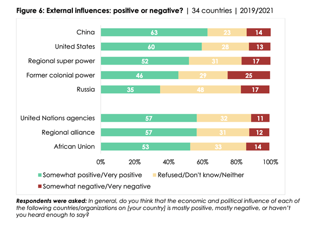 A table showing African public approval ratings for major global and regional powers based on perceived positive influence.