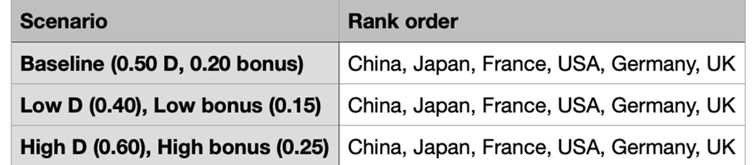 Shifting the diplomacy formula (implementation weight 0.40 – 0.60; summit bonus 0.15 – 0.25) never alters the rank order: China > Japan > France > USA > Germany > UK.