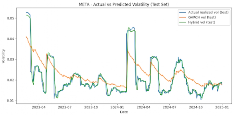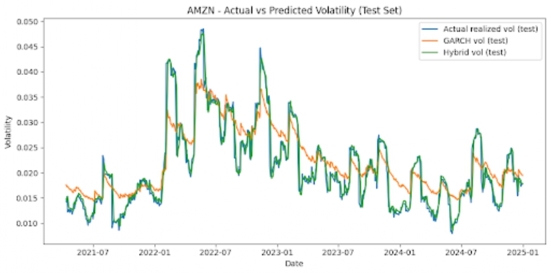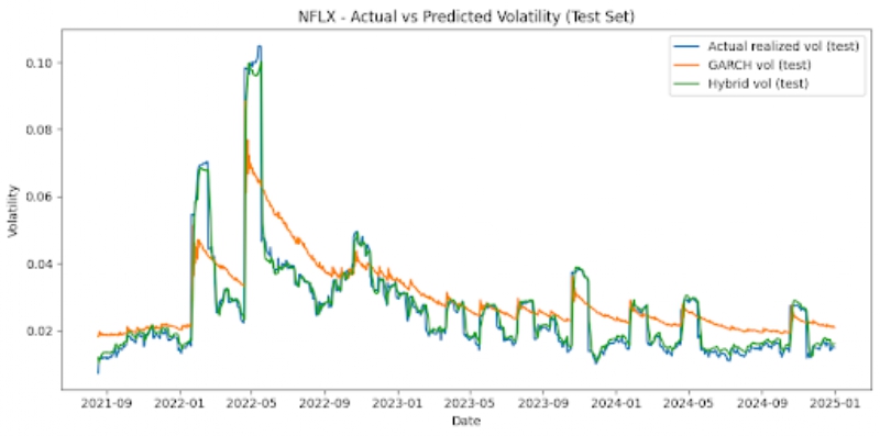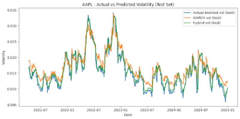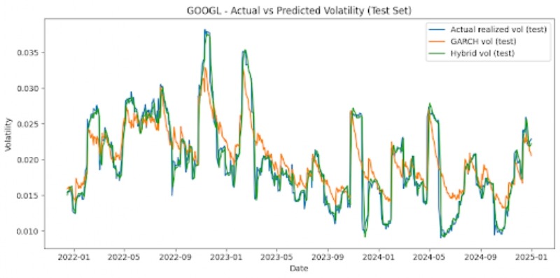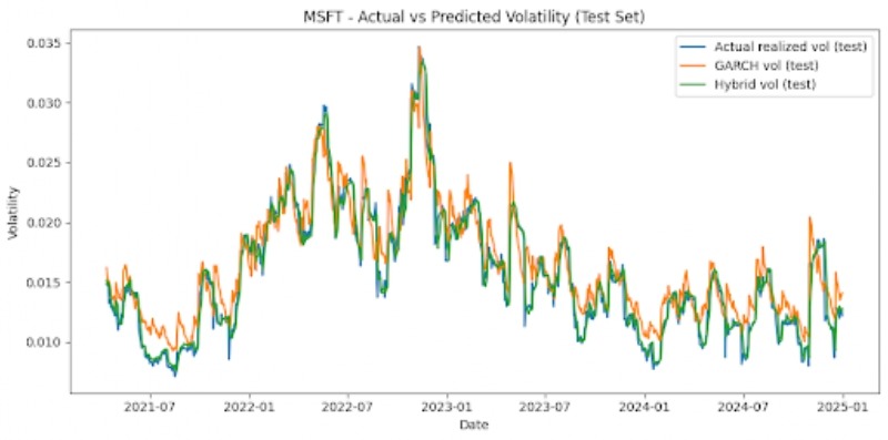 The hybrid model did not simply average predictions equally, but instead assigned dynamic weights to LSTM and GARCH. The weights were chosen to minimize the Mean Squared Error on the validation set. Once both the models were run, the GARCH model provided forecasts from conditional variance, and the LSTM model was able to use previous realized volatility values in order to figure out future volatility. The hybrid model derived results from both of these inputs. We searched over weights w ∈{0,0.01,…1.0} and chose the one that minimized MSE the most on the validation set.