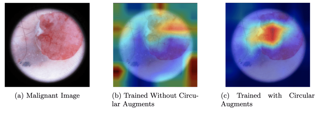 The augmentations were designed to balance variation with preservation of key lesion features. Vertical and horizontal flips—common in computer vision and medical imaging due to flip invariance—were applied alongside color jitter to account for lighting and environmental irregularities. Random rotation leveraged rotational invariance, while translation (0.1 vertical and horizontal) captured translational invariance. Random scaling acted as a background reducer by enlarging lesions and minimizing irrelevant areas, effective given most lesions were centrally located. Random circular cropping, a key augmentation, provided diverse examples and helped the model ignore the lesion’s border outline (see Figure 8 and Figure 9).