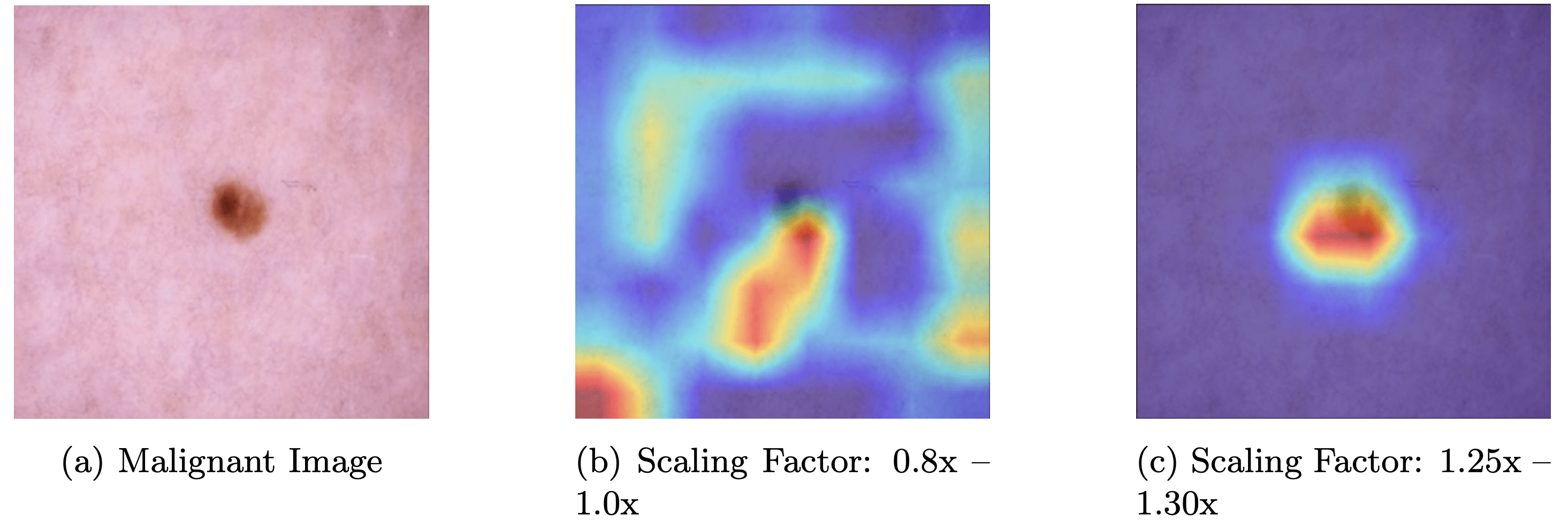 Two variants of the CBAM-EfficientNet architecture, CBAM-EfficientNet-V1 and CBAM-EfficientNet-V2, were evaluated with distinct augmentation strategies and compared to their baseline model counterparts in Table 4. V1 used a scaling of 0.8x–1.0x without random circular crops, while V2 used a scaling of 1.25x–1.30x with random circular crops. CBAM-EfficientNet-V2 outperformed V1 in recall (0.9065) and AUC (0.9354), though it showed slight decreases in F1 (0.8488) and precision (0.8012). Grad-CAM heatmaps from V2 (Figures. 8.c & 9.c) demonstrate improved focus on clinically relevant characteristics, such as irregular borders and color asymmetries in melanoma lesions, compared to V1, which often focused on nondiagnostic skin regions. This suggests that V2’s augmentation strategy better aligns the model’s attention with dermatological diagnostic criteria.