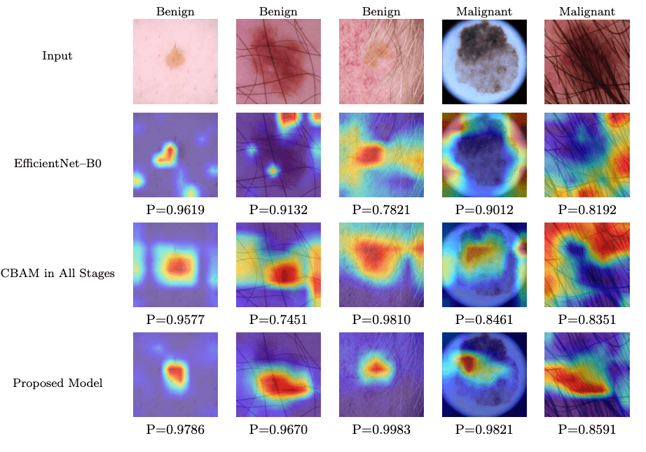 Further insights into the model performance are provided by Grad-CAM heatmaps, as illustrated in Figure 3. This figure compares the heatmaps generated by EfficientNet-B0, CBAM in all stages, and the proposed model across various input images labeled as benign or malignant. The proposed model consistently achieves higher probability scores (model probability values ranging from 0.9670 to 0.9983 for benign cases and 0.8591 to 0.9821 for malignant cases) compared to EfficientNet-B0 (model probability from 0.9619 to 0.8192) and CBAM in all stages (model probability from 0.9577 to 0.8351). These heatmaps highlight the proposed model’s enhanced ability to focus on diagnostically relevant regions, such as lesion borders and color variations, rather than non-informative areas like hair or background skin. This visual evidence supports the quantitative improvements observed in the validation metrics and reinforces the effectiveness of the proposed model’s architecture and augmentation strategy.