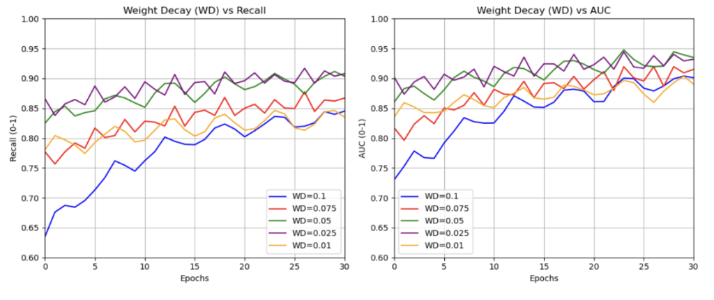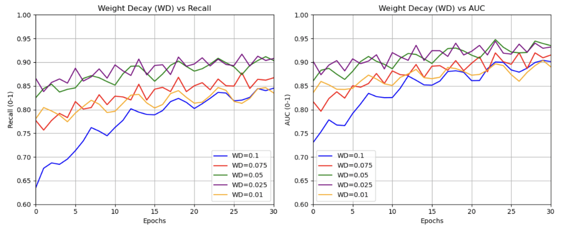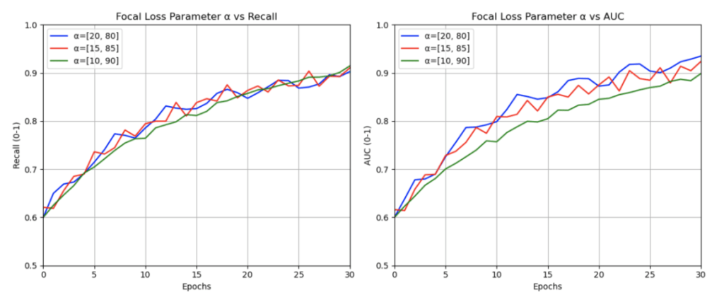 strikes a balance between making meaningful weight updates and avoiding overriding the pretrained weights, as indicated by the dashed lines in the plot. Focal loss was chosen to address the significant class imbalance in the ISIC dataset, prioritizing malignant recall, with various