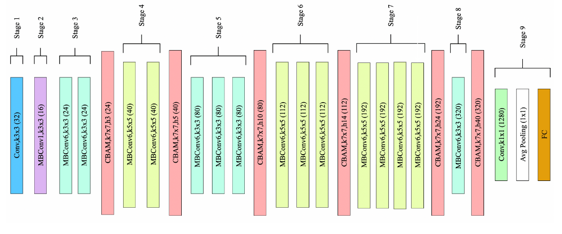 The model was trained using a two-stage technique. In Stage 1, the backbone feature extraction layers (stages 1–8) were frozen, and only the CBAM modules and stage 9 (fully connected layer) were trained, with a learning rate of . The AdamW optimizer was employed with a weight decay of