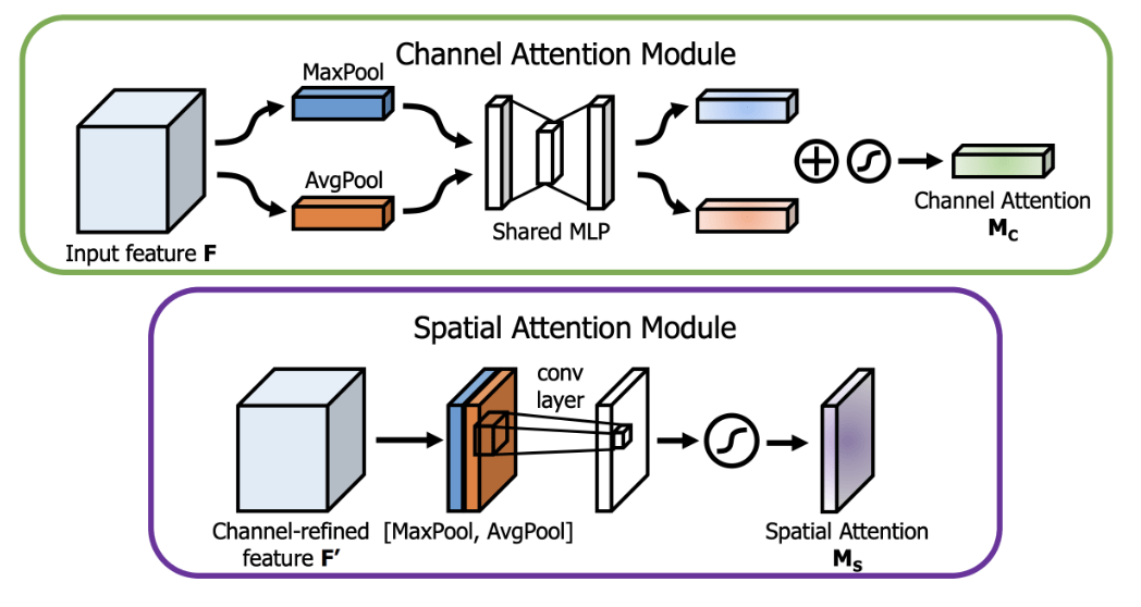 Channel Attention Module (CAM): CAM is illustrated in Figure 1—adapted from Woo et al. (2018)9)—, and addresses the question of “what” is important by modeling interdependencies among channels. It aggregates spatial information using two distinct pooling operations: global average pooling, which computes the average intensity across each channel, and global max pooling, which identifies the maximum activation. This mechanism is particularly effective in skin lesion classification, where certain channels may correspond to specific visual cues, such as color variations or texture patterns, that are indicative of malignancy.