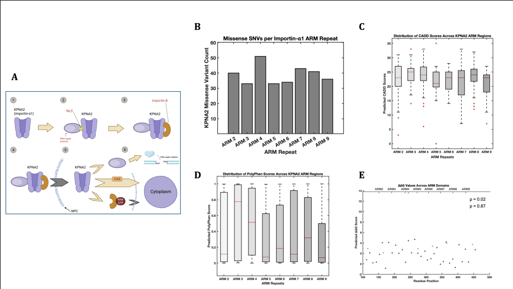 Specific genetic mutations can be tracked across populations in studies known as Genome-Wide Association Studies (GWAS). GWAS measures the density and frequency of mutations known as single-nucleotide polymorphisms, commonly referred to as SNPs9. These mutations are particular, single-nucleotide mutations (SNVs) that exist in at least one percent of a species’ population. Although not all, many SNPs can also influence the phenotype of an organism, in a possibly immoderate manner10. Despite extensive study of importin pathways, the impact of specific KPNA2 variants on cargo binding and nuclear transport efficiency and functionality remains poorly understood. Our study investigates the structural and functional consequences of rare missense SNPs in the ARM domains, specifically the major and minor binding regions, of KPNA2, particularly focusing on their effects on DNA repair cargo docking11. Moreover, several data have shown how KPNA2 is largely overexpressed and dysregulated in many cancer tissue data sets, adding clinical significance to this study as well12,13,14. It is hypothesized that specific SNPs in key ARM regions will structurally and energetically disrupt KPNA2’s binding affinity with DNA repair cargo. Here, we present peculiar and nuanced relationships between genomic and proteomic variants, as well as other factors that may have an impact on mutation-induced structural and functional damage. Each of our chosen SNP-induced KPNA2 proteins underwent tests that intrinsically described the effects that their respective SNP had on their stability. Subsequently, they were analyzed to assess the possible severity of these effects on a widespread impairment of the DNA repair system.
