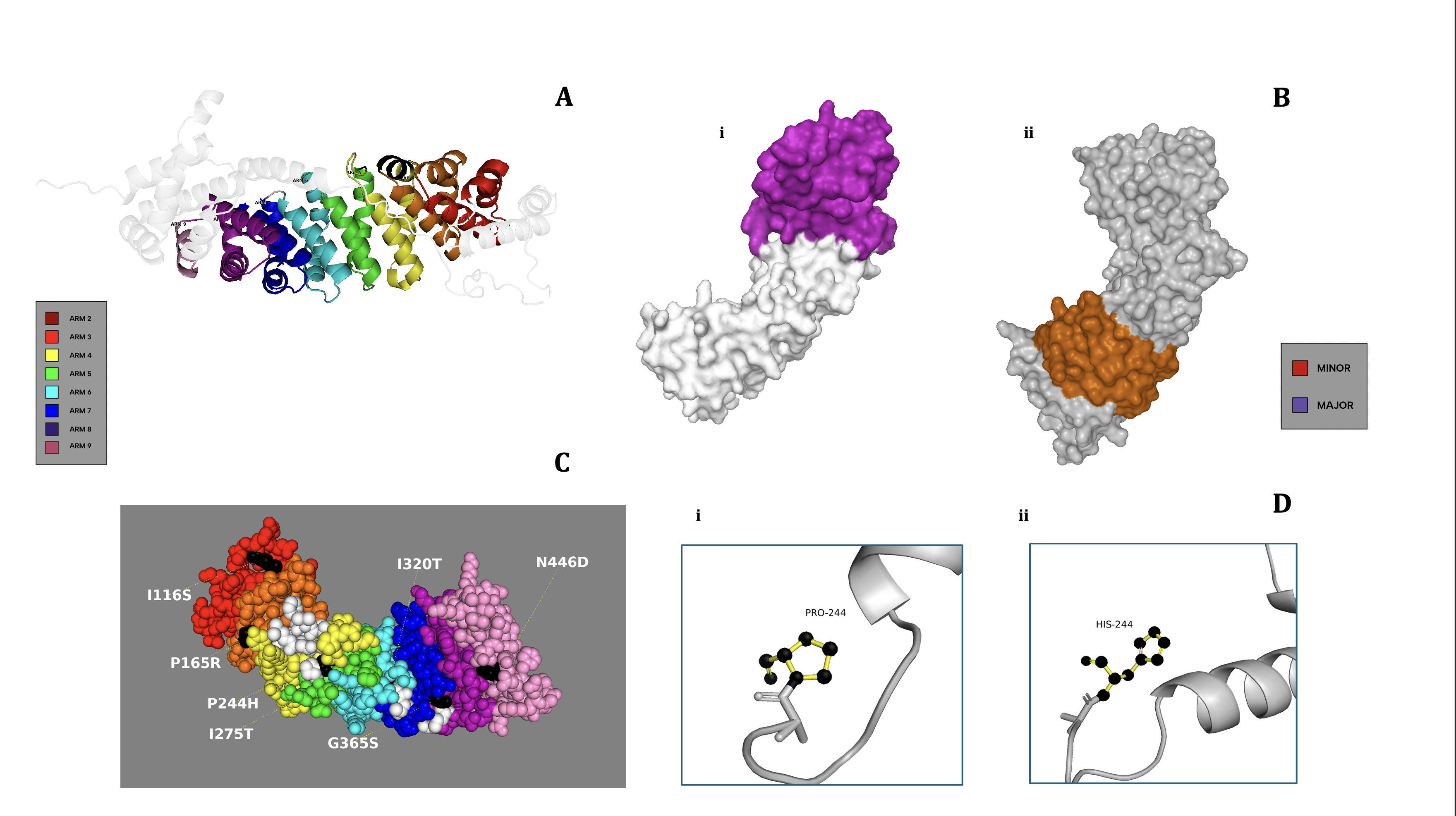 The ribbon model (Figure 2A) of the entire KPNA2 protein illustrates the overall curvature and highlights the location of each ARM repeat along the binding groove and structural contour. This model offers a general overview of the protein, but for a deeper focus on the ARM domains, Figure 2B provides a surface-rendered model. This representation distinguishes between the major binding region (ARMs 2–4, Figure 2B(i)) and the minor binding region (ARMs 6–9, Figure 2B(ii)). According to Table 1, variants I116S, P165R, and P244H are located within the major binding region, whereas I320T, G365S, and N446D reside in the minor region. Notably, despite the greater functional relevance of the major domain, predictive scoring suggests that SNPs in the minor region may exert comparable functional and structural disruptions; this implies that both domains are functionally significant and potentially vulnerable to disruption. The models also show that these regions extend into the protein’s binding groove, reinforcing the idea that mutations in either domain could impair the cargo transport capabilities of KPNA2.