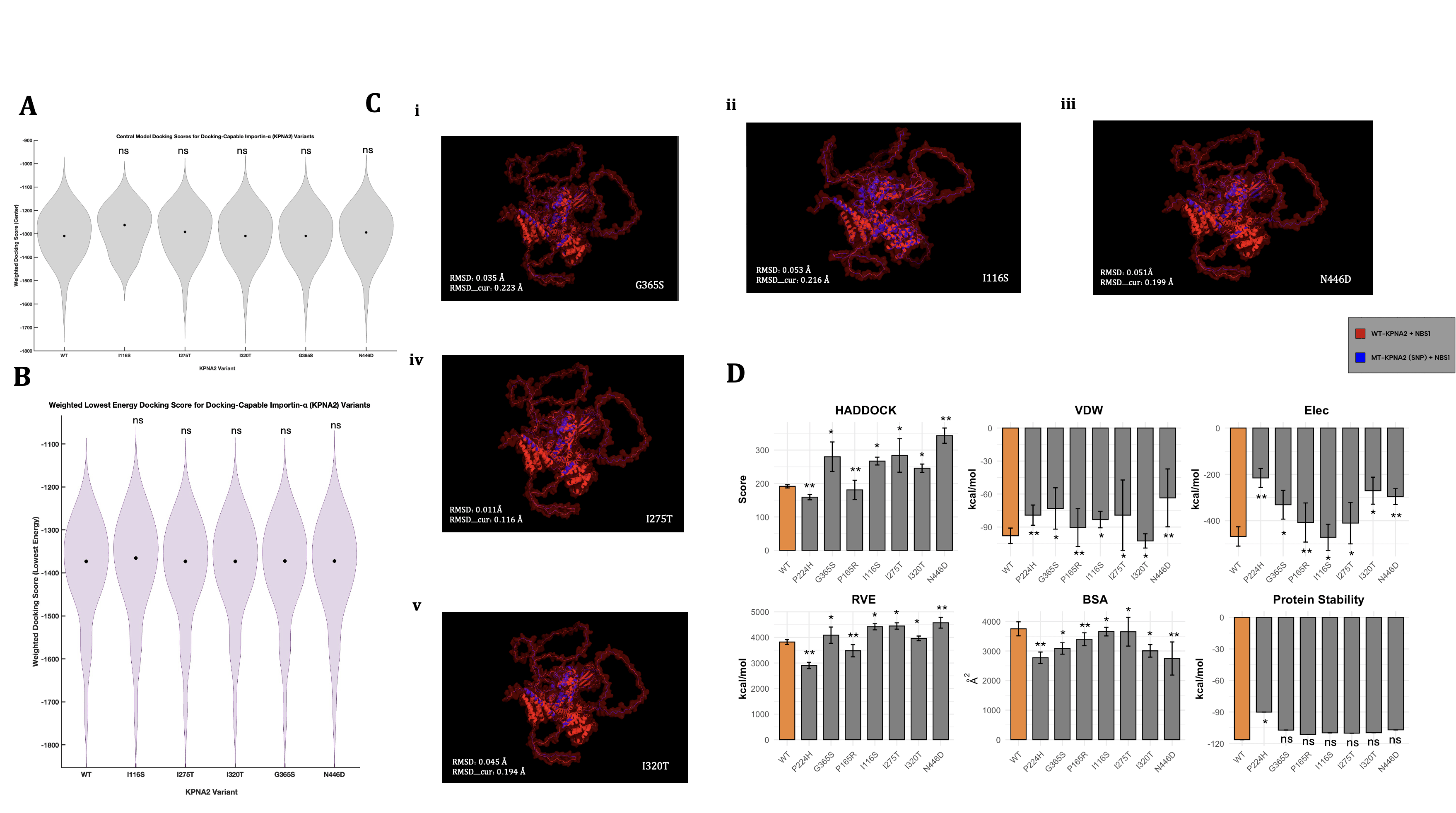 SNP N446D (Figure 3C(iii)) also displayed a slight increase in blue appearance, yet not nearly as evident as the I116S-KPNA2 docking model, and therefore, insignificant. For quantitative analysis of the same structural differences, we used RMSD to pinpoint the exact severity of the structural separations. The RMSD (avg=0.039 Å) and RMSD_cur (avg=0.189 Å) scores remained low and consistent across all variant testing, with the only slight outlier being SNP I116S, as expected, resulting in the highest of both types of RMSD scoring. Mirroring Figures 3A, 3B, and 3C, the RMSD docking simulations indicated consistent structural divergencies across all tests, except I116S, which again showed higher deformations of some sort. It is important to note that the conclusions that arise from the visual analyses executed in Figure 3C are relative, as a control relationship between blue and red cannot be accurately measured without proper experimental testing and is solely based on comparisons to a wild-type computational test.