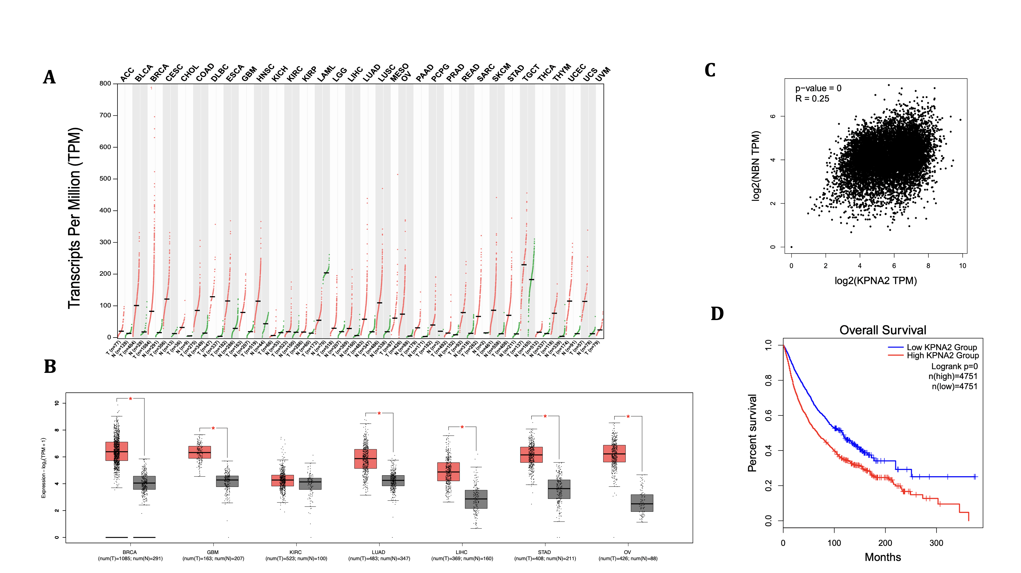 Although missense mutations in KPNA2 can be detrimental regardless of the cargo used for binding, NBS1 was specifically chosen due to its critical role in double-stranded break repair (DSBR). The usage of a DNA repair enzyme adds biological significance, as missense mutations in KPNA2 will have a larger amplification consequence if the cargo being bound is a repair enzyme. Furthermore, correlations could also be created to link specific SNPs to possible cell-wide DNA repair failure. Regardless of SNP mutations, however, KPNA2 expression, correlation, and impacts on survival levels in cancers can help identify oncogenic linkage between importin-ɑ production and cellular responses (Figure 4). Moreover, the gene’s expression can help solidify the exact consequential effects that damaging missense mutations will have on the cell. Across the tissue profile (Figure 4A)—which consists of 33 various tissue and cancer types—KPNA2 gene expression in each tissue is elevated in the cancerous samples compared to their respective non-cancerous tissues. Kidney chromophobe (KICH) and acute myeloid leukemia (LAML) are the only instances, however, where the median gene expression (TTM) of the non-cancerous tissue (KICH=15.37, LAML=203.97) is greater than that of the cancerous tissue (KICH=6.22, LAML=54.44), indicating severe genetic downregulations. In comparing the median gene expression scores, the cancerous tissue that ranked the highest was TGCT (229.51), with the highest median for non-cancerous tissue being the aforementioned LAML test (203.97). Spreads of expression levels do vary across the KPNA2 profile; yet, BRCA had the highest range, with its highest (cancerous) expression value at approximately 690, indicating possible heterogeneity within the collected data.