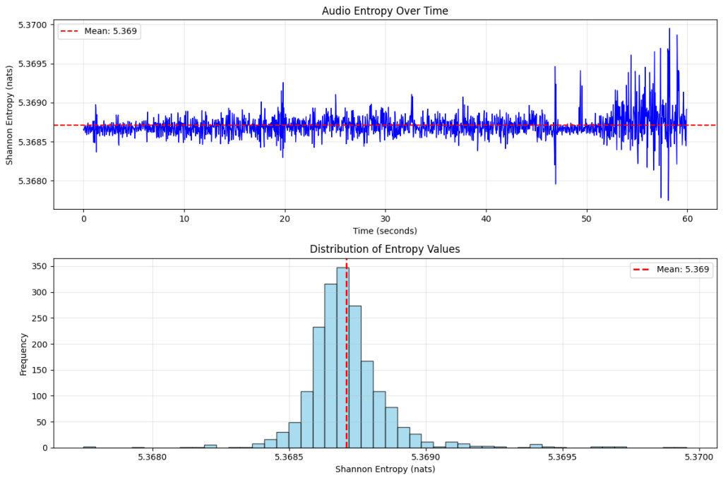 This study demonstrates a rigorous, multi-level methodology for quantifying the structure, diversity, and temporal dynamics of cetacean vocalizations. Shannon entropy analysis of symbolized vocal segments revealed moderate to high repertoire diversity, suggesting that the subject whales produced communication signals far from random noise yet not as rigidly stereotyped as pure tonal calls. Segment entropies ranging from 3.17 to 4.54 bits indicated structured yet varied vocal behavior, with low intra-recording standard deviations supporting the presence of consistent motifs.