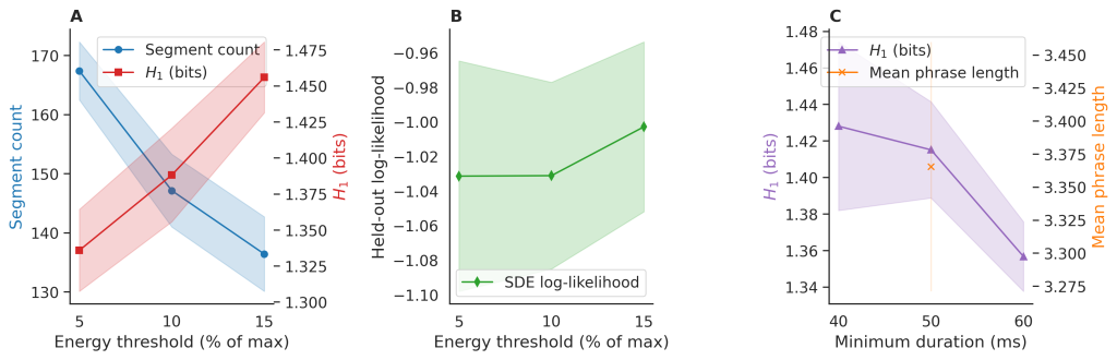 Segmentation employed short-time energy with a 10% threshold of maximum frame energy to detect vocal activity, chosen for its balance in capturing subtle calls while rejecting ambient fluctuations. The 50 ms minimum duration filter eliminated transient artifacts, reflecting typical cetacean call lengths. To assess robustness, we conducted sensitivity checks by varying the energy threshold by ± 5% (5-15%) and ± 10% (0-20%), and the duration minimum by ± 5 ms (45–55 ms) and ± 10 ms (40–60 ms). Across 10 recordings, segment counts varied by <8% on average, with entropy estimates stable within 0.12 bits (SD=0.07), confirming parameter insensitivity.