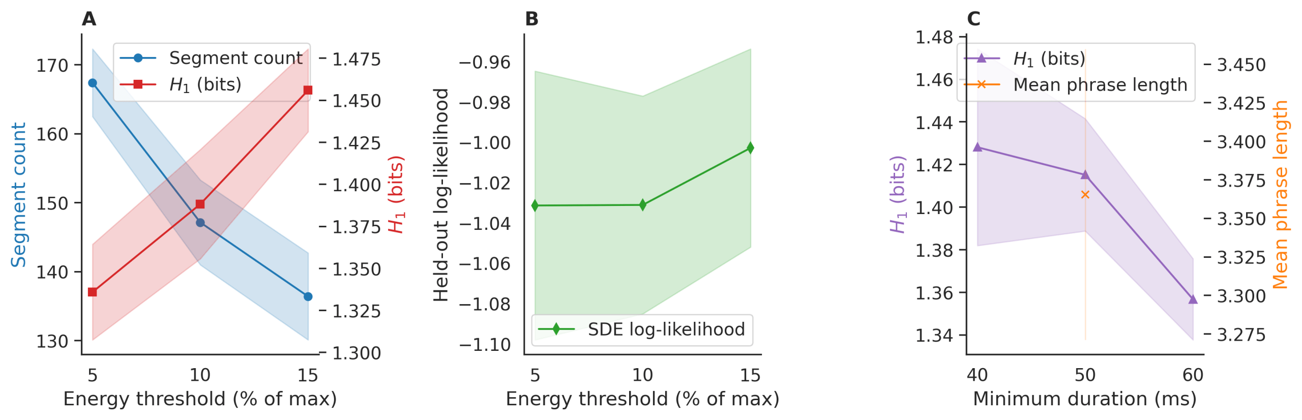 Blue whale units (tonal moans, upsweeps, downsweeps) have mean durations of 0.8–3.1 s, with the shortest known components (e.g., pulsed onsets) exceeding 40 ms. A 50 ms cutoff excludes transient artifacts (e.g., cavitation, vessel clicks) while preserving all known unit types. Sensitivity tests at 40 ms, 50 ms, and 60 ms thresholds changed segment count by ± 6.8% and H1 by <0.05 bits (SD = 0.03).