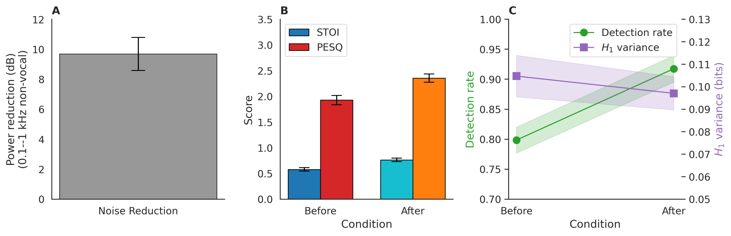 Perceptual Evaluation of Speech Quality (PESQ): increased from 1.94 to 2.41 (MOS-LQO scale, Δ = +0.47).