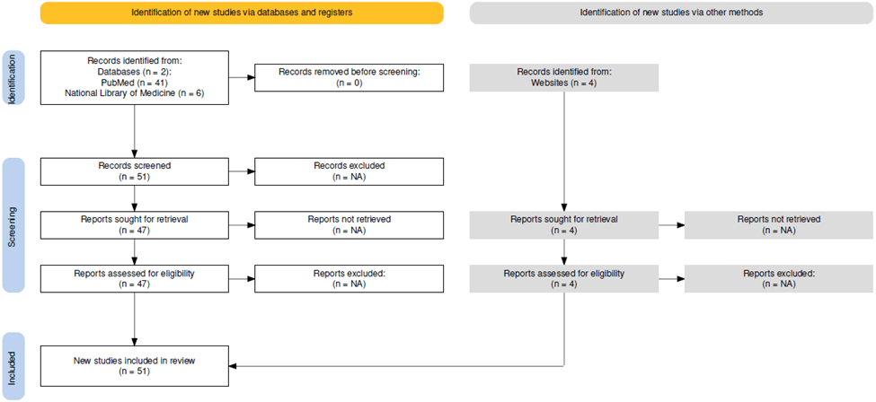 Several databases were searched, including PubMed and the National Library of Medicine, to retrieve information relevant to this literature review’s topics (Figure 1). The databases PubMed (records identified, n = 41) and the National Library of Medicine (records identified, n = 6) include randomized trials and systematic reviews. The reference lists in several of the papers used were also checked. A comprehensive summary of all references is provided below (Table 4). Searches for articles were also conducted on the internet; some of the references were from respectable websites and books as well. The main keywords that were used to conduct searches for articles were the following: stroke, post-traumatic stress disorder (PTSD), ischemic stroke, hemorrhagic stroke, and post-stroke PTSD.