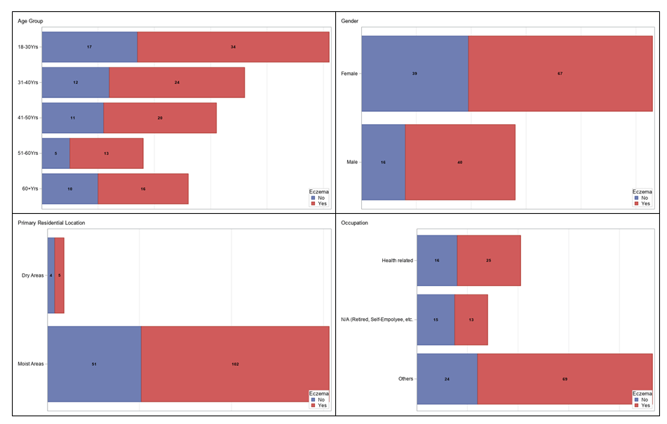 Descriptive statistics were computed for all variables, stratified by eczema status. Continuous variables were presented as means and standard deviations, while categorical variables were summarized as frequencies and percentages. Chi-Square / Fisher Exact tests were conducted to test the statistical significance of the difference between participants with and without eczema for different parameters. P-values were calculated at a 95% confidence interval to indicate the statistical significance.