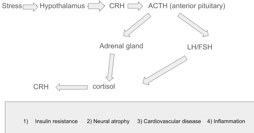 The neuroendocrine system bridges the gap between the nervous and endocrine system by regulating bodily functions through nerve and hormone producing cells (Canadian Cancer Society). It controls vital processes like reproduction, growth and metabolism while keeping homeostasis of stress levels in the body and regulating neural plasticity. Prolonged elevation in Corticotropin-releasing hormone (CRH) levels causes chronic stress due to the suppression of the BDNF gene expression in key areas of the brain. This happens as CRH is released by the hypothalamus, which subsequently secretes ACTH and cortisol from the adrenal cortex. Higher CRH levels lead to overproduction of cortisol which diminish the amount of critical neurotrophins present. The drop of these BDNF levels damages neural plasticity, synaptic strength, neurogenesis and dendritic remodelling (Yang et al., 2020).