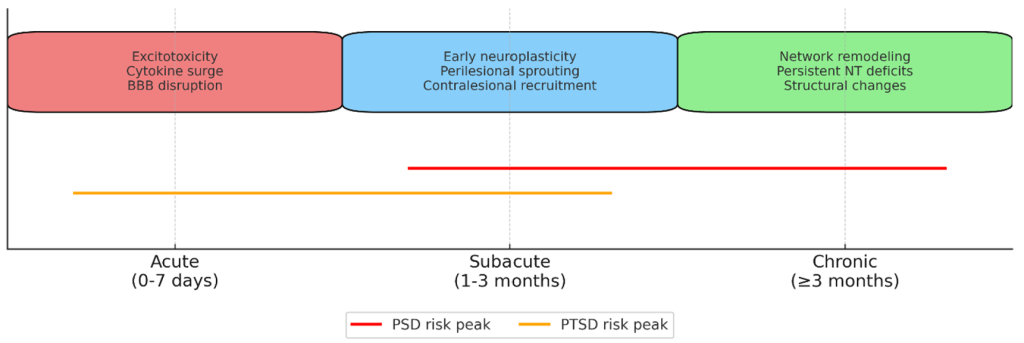The left limbic-cortical-striatal-pallidal-thalamic (LCSPT) circuit has emerged as a key neural substrate underlying PSD. Terroni et al. reported that larger lesion volumes within the left LCSPT circuit, which encompasses the ventromedial prefrontal cortex, anterior cingulate cortex, amygdala, and associated subcortical regions, are robustly correlated with the incidence of major depressive episodes within months after stroke7. The timeline of PSD and PTSD development is further explored in Figure 2. This finding aligns with earlier studies that recognized the importance of disrupted prefrontal-limbic integration in mediating depressive symptoms8. Moreover, Wei et al.’s meta-analysis suggests that while both hemispheres can be involved, right hemisphere lesions may increase depressive symptomatology within the subacute phase of stroke, whereas left hemisphere damage is more consistently associated with chronic, disability-driven depression9.