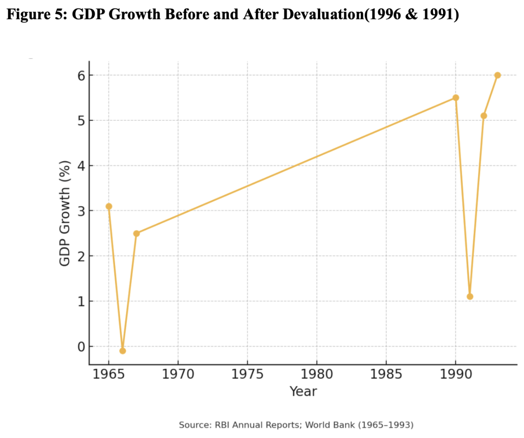 In 1991, devaluation occurred as a part of a structural adjustment program whose aim was to be able to stabilise the Indian economy during an impending financial collapse. This happened when India had dwindling foreign reserves and was on the path to defaulting on foreign debt. By devaluing the rupee by 19.5%, India tried to avoid such a path. While this move, in tandem with economic liberalisation, was the cornerstone for India’s future economic growth and helped stabilise the economy, attract foreign investment, and set the stage for India’s rapid economic growth in the decades that followed, it also brought severe challenges. Inflation rates went up drastically, the cost of imports rose, and foreign debt obligations grew in burden as they were mainly dealt with in USD. However, notably unlike what happened in 1966, India’s 1991 devaluation is seen to be part of the larger liberalisation reforms that were responsible for it to become a globally competitive economy.