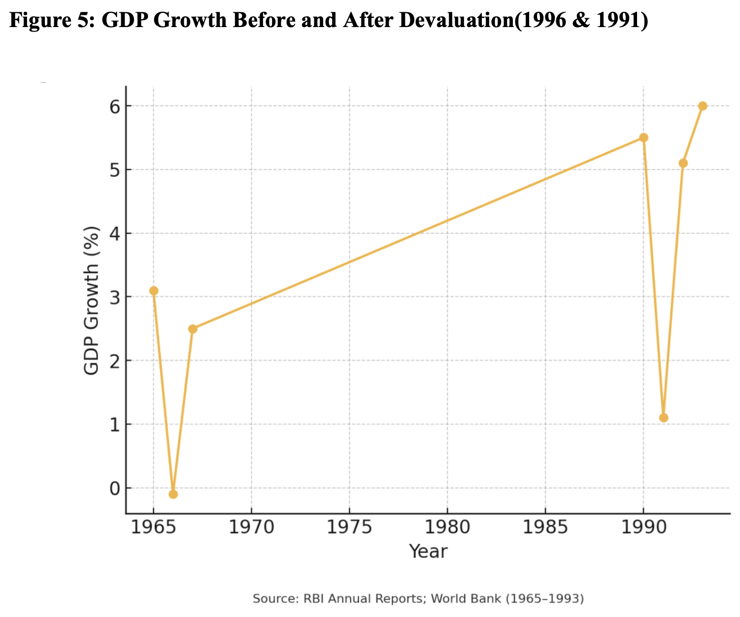As seen in figure 5, GDP growth contracted sharply following both devaluations, consistent with short-run contractionary pressures. Recovery within 1–2 years suggests the importance of structural reforms and stimulus.