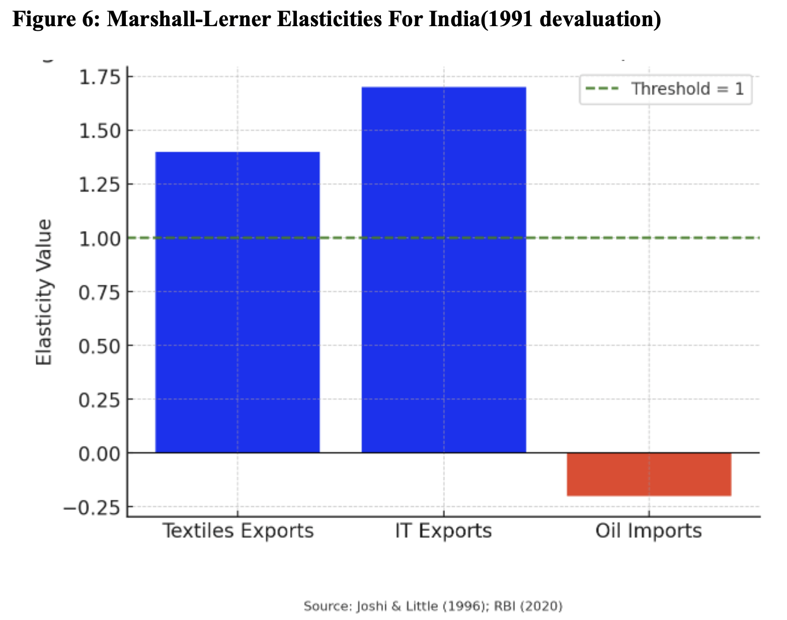 Currency devaluation initially was seen as a tool which could enhance export competitiveness and correct trade imbalances. Marshall and Lerner provided the foundational basis for understanding how devaluation could improve the trade balance through the Marshall-Lerner Condition1. However, later scholars such as Krugman and Taylor (1978) argued that this optimism may be misplaced, as devaluation can be contractionary in the short run by raising import costs and reducing real wages, which shows the divide in how economists view the condition’s reliability. This condition often fails in developing countries like India, where imports such as crude oil, machinery and medical supplies are inelastic2. The Reserve Bank of India estimates that the price elasticity of oil imports is approximately -0.2, indicating that devaluation has a limited effect on reducing oil demand2. On the other hand, India’s export goods, particularly in IT and textiles, demonstrate higher price elasticities, making them more responsive to devaluation. Joshi and Little (1996) estimated that the price elasticity of India’s textile exports was about 1.4 and IT services between 1.2 and 1.7, meaning a 1% fall in export prices led to a more than proportional rise in export volumes. This indicates that devaluation strongly boosted export growth in these sectors compared with the pre-1991 trend, when export growth was far more modest3.