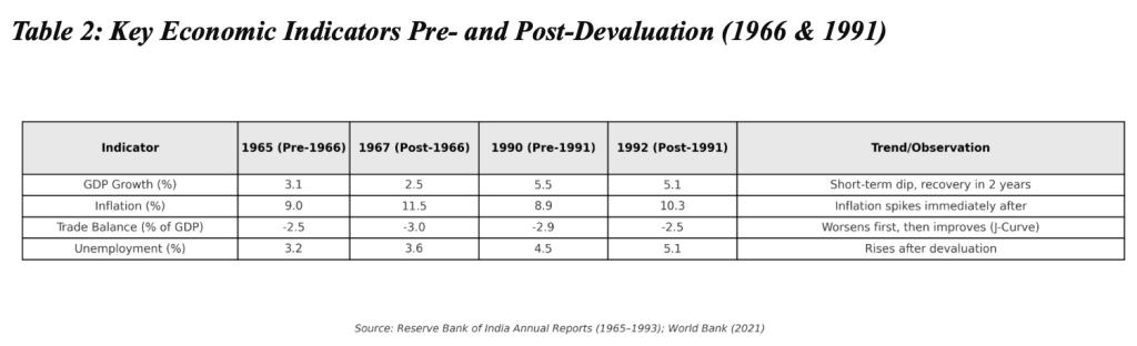 While Table X demonstrates that India’s trade elasticities satisfied the Marshall–Lerner condition in theory, the overall macroeconomic impact of devaluation is best understood by looking at broader indicators. Table Y provides a systematic summary of GDP growth, inflation, trade balance, and unemployment before and after the 1966 and 1991 devaluations, complementing the earlier figures.