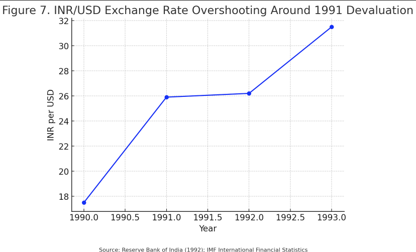 As can be seen in figure 7, the rupee depreciated sharply from ₹17.5 per USD in 1990 to ₹25.9 in 1991, before stabilising near ₹26–31 in the following years. This pattern illustrates Dornbusch’s overshooting: a rapid depreciation overshooting equilibrium, followed by partial correction as reforms and IMF support restored stability.