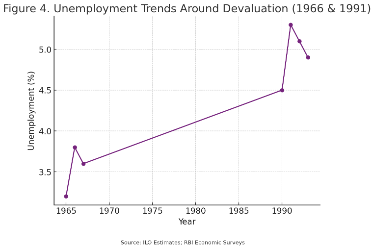 In figure 4 we can see unemployment edged upward post-devaluation. Import-reliant sectors suffered, even as export-oriented industries eventually rebounded.