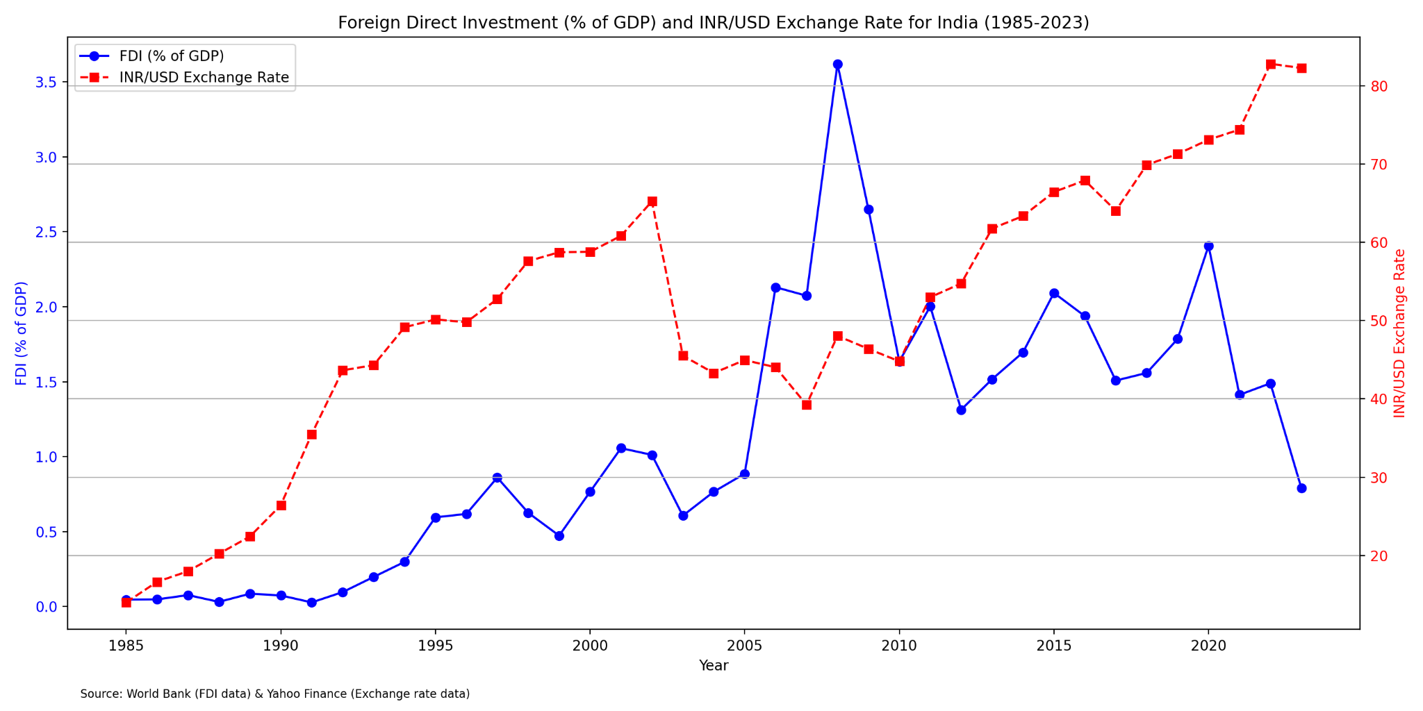 Devaluation involves substantial dangers, especially when it indicates economic instability, but it can also present chances for international investment. Investors who are worried about the long-term stability of the Indian economy may be discouraged by a significant depreciation. According to Aizenman and Noy41, even if FDI inflows may rise immediately following a devaluation, investor confidence can eventually weaken if the devaluation signals deeper economic issues.