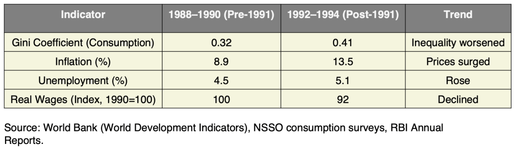 Between 1988–1990 and 1992–1994, India’s Gini coefficient rose from about 0.32 to 0.41. This worsening inequality coincided with a sharp rise in inflation (from 8.9% to 13.5%), higher unemployment (from 4.5% to 5.1%), and a fall in real wages (index down from 100 to 92). These shifts occurred directly in the aftermath of the 1991 devaluation, suggesting that currency depreciation amplified inequality by eroding real wages and raising living costs. However, notably, broader liberalisation reforms were also underway during this period, meaning devaluation was not the sole driver. Still, the timing and correlation across multiple indicators provide evidence that devaluation was a significant causal factor in worsening income inequality in early-1990s India.