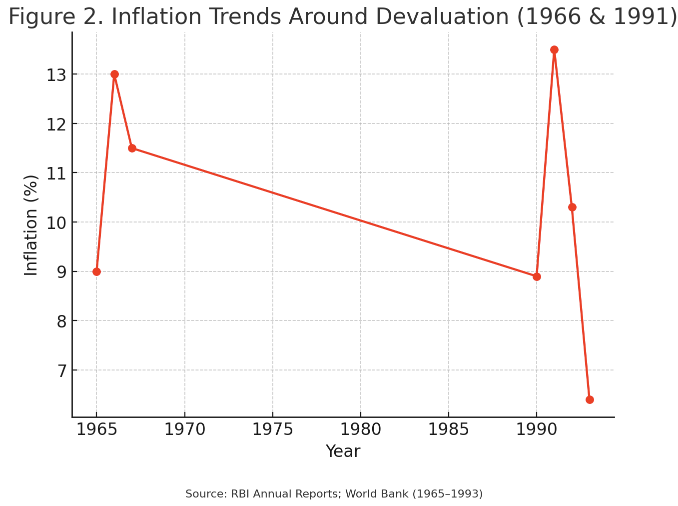 Focusing now on India, two major events shaped its devaluation experience: the 1966 devaluation and the economic reforms of 1991. Due to a growing trade deficit and a foreign exchange crisis, the rupee saw a 57% devaluation in 1966. India devalued its currency in response to pressure from foreign lenders like the World Bank and the International Monetary Fund (IMF), hoping that this would assist to boost exports and ease the nation’s escalating economic issues. While some of these goals did end up being achieved, the economic decision also led to high levels of inflation, social unrest, job losses, and political instability. In an attempt to boost exports and stabilise the economy, a currency devaluation was implemented. The devaluation did, however, result in inflation, increased import costs, and considerable social dissatisfaction in addition to improving the trade balance. The increased prices caused much struggle for many Indian firms, especially those dependent on imported commodities, which resulted in job losses and a drop in industrial production. Politically, the devaluation was extremely unpopular and played a part in the Congress Party’s defeat in the elections that followed.