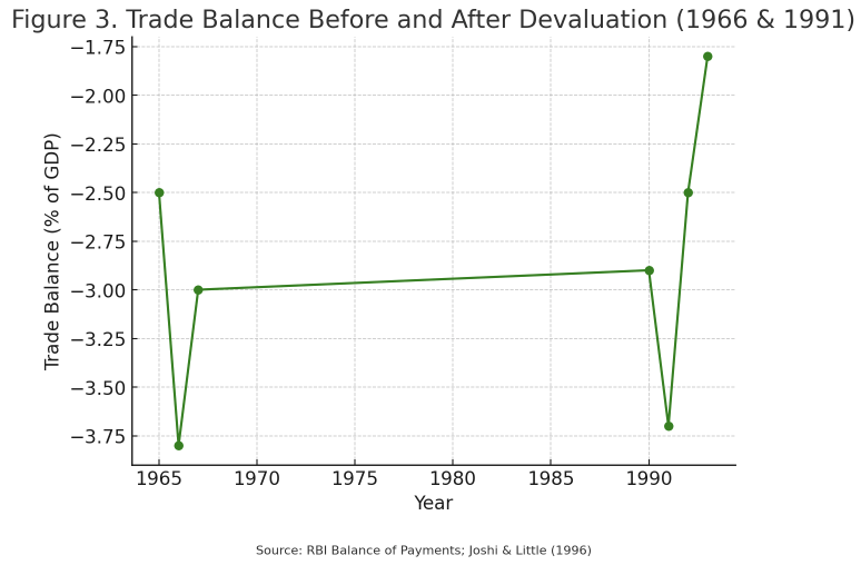 The J-Curve Effect is another important empirical finding in the context of India’s devaluations8. According to the J-Curve hypothesis, the trade balance initially worsens following devaluation because import prices rise more quickly than export volumes can adjust. In India’s case, both the 1966 and 1991 devaluations followed this pattern. As documented by Joshi and Little, the 1991 devaluation caused the trade deficit to widen by nearly 2% of GDP in the first year, before export growth caught up in subsequent years3. By 1993, India’s export growth had outpaced import costs, resulting in a gradual improvement in the trade balance.