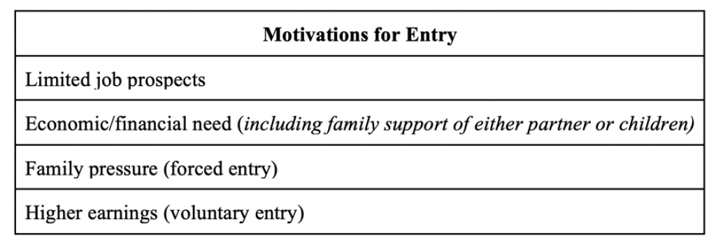 Motivations for entry were then analysed using the same coding framework. Themes included financial/economic needs, family pressure, or voluntary entry for higher earnings.